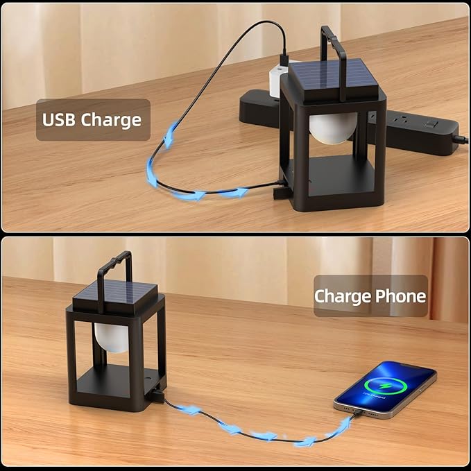 - ๐๐ฐ๐จ ๐๐ก๐๐ซ๐ ๐ข๐ง๐ ๐๐จ๐๐๐ฌ๏ผSolar lanterns lights have 2 charging modes: solar panel and USB charging. Indoor can be used by USB charging; Outdoor lights can be charged by the solar panel on the top.Solar garden lanterns built-in 4800mAh battery, working time up to 8-10h, multiple charging modes can be used even on cloudy days