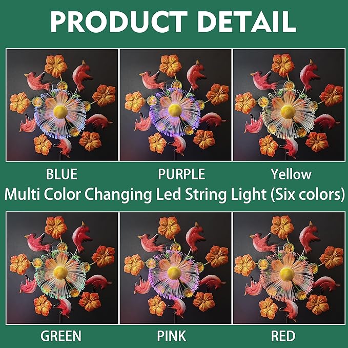 - 【Easy installation】The wind spinners are very easy to install, just tighten all the components and insert them into the ground or lawn to decorate your yard, garden, etc. The colored LED lights will automatically turn on and can last for 8 hours or longer at night.