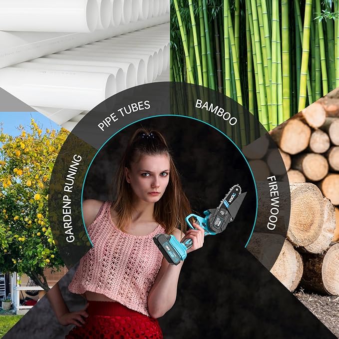 - 【Lightweight and Portable】This 4-inch electric chainsaw cordless weighs only 2.4 pounds (including one battery),making it a truly portable tool. As a handheld chainsaw,its single-hand operation design prevents arm fatigue,allowing women and the elderly to carry it effortlessly and perform cutting tasks anytime,anywhere