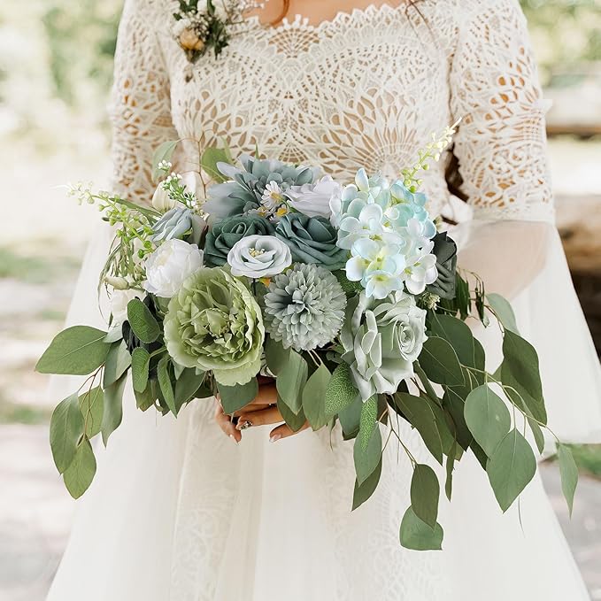 AGIRL Artificial Flowers Combo Silk Mix Green Fake Flower with Stems for DIY Wedding Bouquets Centerpieces Arrangements Table Chair Decor Baby Shower Home Decor (Sage Green)