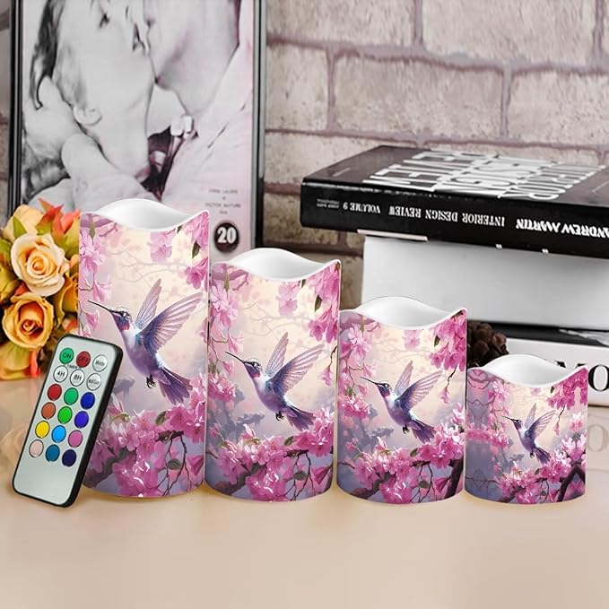 Ystardream Hummingbird Operated Candles with Flickering Flame Flameless Taper Candles Flickering Peach Blossom Operated Electric Pillar Candle LED Candle for Indoor Outdoor Home Decor