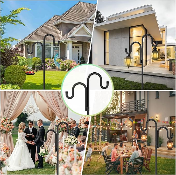 - 【Versatile use】Shepherds hooks for outdoor heavy duty are perfect for hanging bird feeders for outside, hummingbird feeders, squirrel proof bird feeders, wreaths, wind chimes, outdoor wedding aisle decorations, lanterns, candle lanterns, solar lights, string lights, street lamps, candlesticks, birdbaths, kissing flower bulbs, flower pots, plants, targets and more.