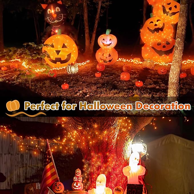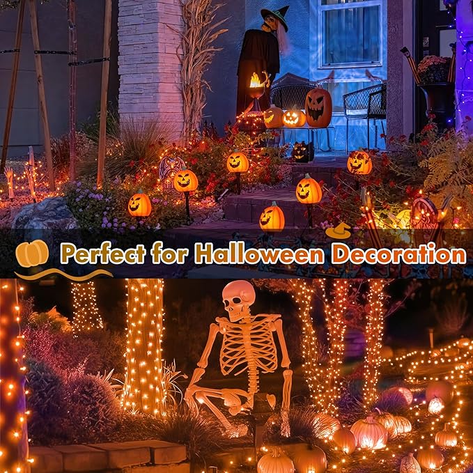 - Orange Halloween lights outdoor: Illuminate the night with the Twinkle Star 4 pack of 120 super bright LED solar lights. Made from thin and flexible copper wire, you can easily build the shapes you want, enhancing outdoor lighting in any holiday season. The string of lights is 39.4 ft, long power cord: 6.5 ft, total length: 45.9ft