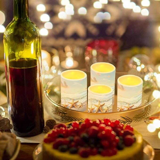 Flameless LED Candle Electric Pillar Candle with Remote Timer Color Changing Control Long Lasting Pack of 4 for Tabletop Coastal Home Indoor Decoration, Beach Gold Starfish
