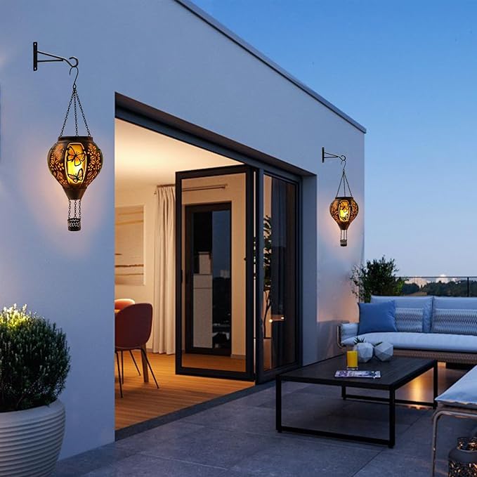 - 【Hot Air Balloon Design】Hot air balloon solar lanterns outdoor hanging is made of high quality glass and metal with rust-resistant coating.The hot air balloon solar lamp is waterproof and does not break and deform easily with a long service life. Metal with solid glass panels and realistic scintillations of light make for enchanting gardens, patios, yards, paths and more accents.