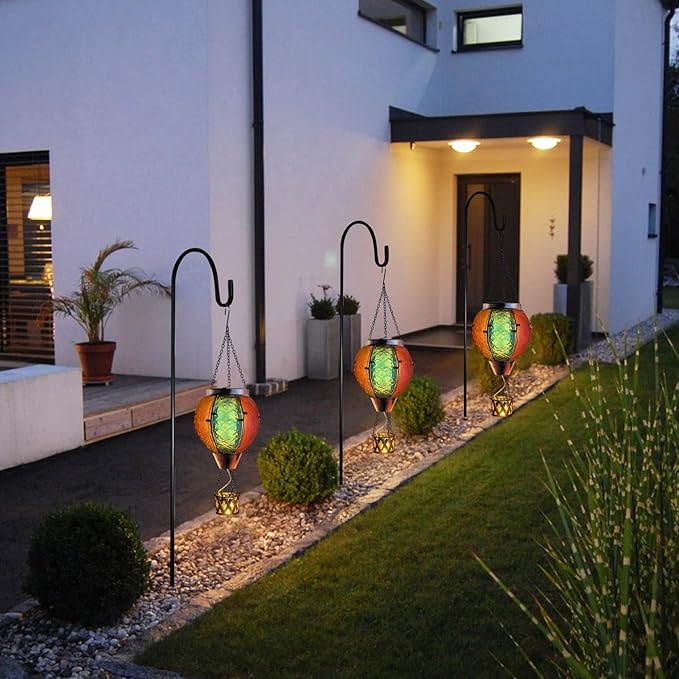 - Weather Resistance - The solar garden hot air balloon flickering flame light uses IP44 waterproof material, do not worry about rain and snow weather, can be safely decorated in your garden, terrace, balcony, fence, pavilion and other outdoor places.