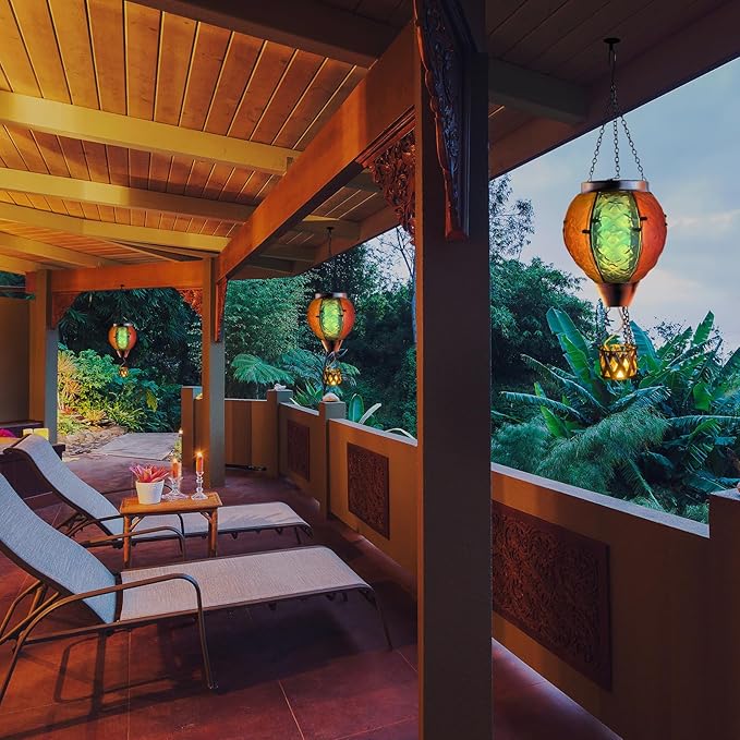 - Solar Powered - Solar hanging lanterns outdoor with solar panels on top that turn on and off to absorb solar energy and charge during the day and light up automatically at night, flashing lights like flames bring an active atmosphere to your yard. Charge 6-8 hours can be illuminated 8-10 hours.