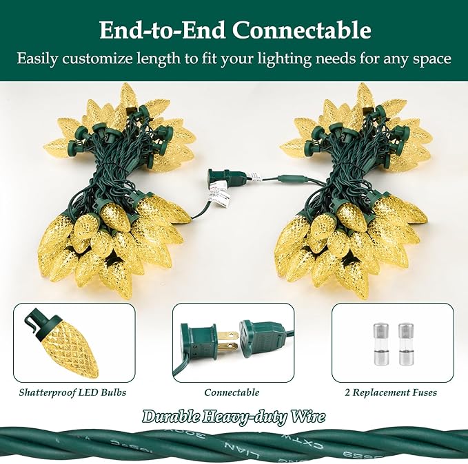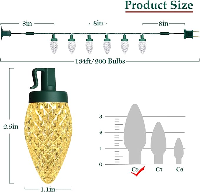 - 🍓【Shatterproof C9 Strawberry LED Bulbs】 Each strand of string lights is 134 feet long and equipped with 200 bright C9 strawberry-shaped LED bulbs. They are easy to use - just plug and unplug for ON and OFF - and long enough to wrap around a Christmas tree or anywhere else you'd like to add some light, such as your porch, garden, lawn, yard, or roof.