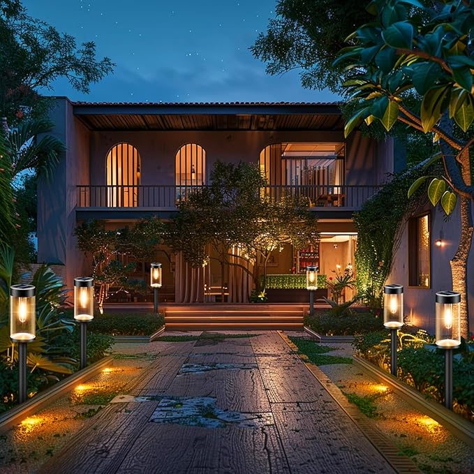 - Suitable for All Weather: Solar garden lights is made of ABS shell, transparent lampshade and stainless steel pole, sturdy and durable. IP65 waterproof rating, solar path lights can withstand all kinds of bad weather. No need to worry about rain, sunshine, fog, snow
