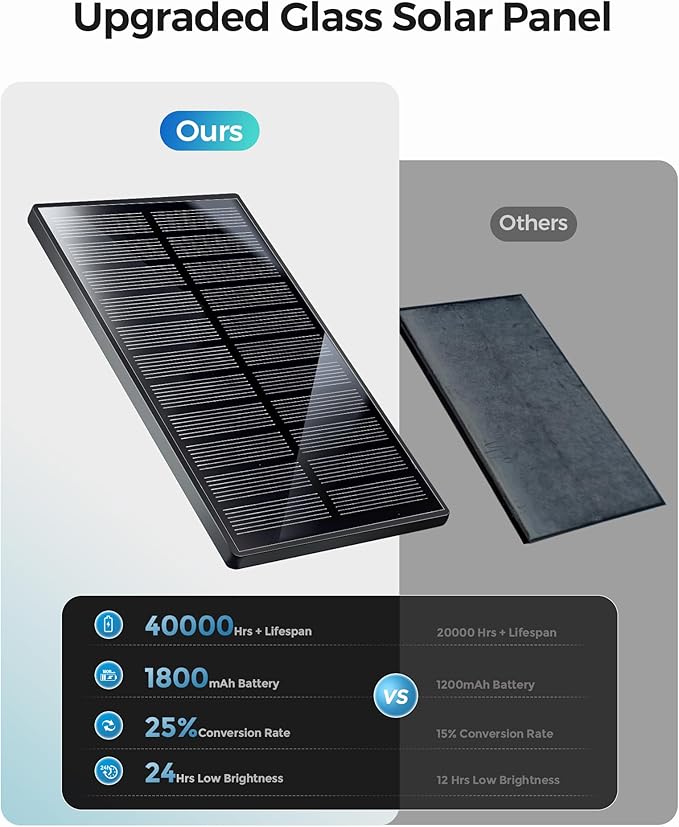 - 【Larger Solar Panel & 1800mAh Battery】Brthera solar color changing lights outdoor is equipped with a larger solar panel 3.35“*6.1” (other products: 2.5“*4.3”) that can convert sunlight at an efficiency of 25%. The built-in 1800mAh battery can provide 6~15 hours of lighting after fully charged.