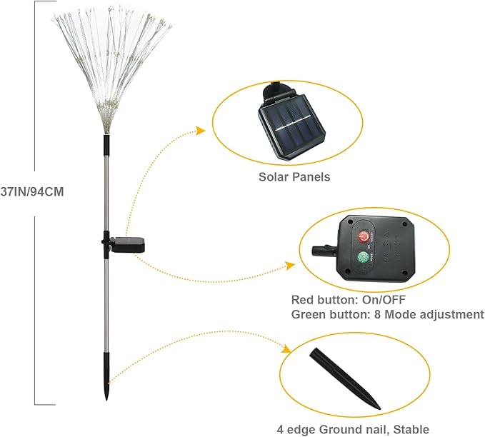 - 【Easy to install and versatile】No wires or other tools are needed to install this garden light,with the new four-pronged ground spike,the installation is more stable and sturdy. Simply install the solar decorative lights in your garden and turn on the switch, which emits beautiful and colorful light spots lifelike fireworks creating a romantic holiday atmosphere. Suitable for outdoor decorations in yards, flower beds, lawns and sidewalks as well as Christmas, weddings, parties and any other occasions.