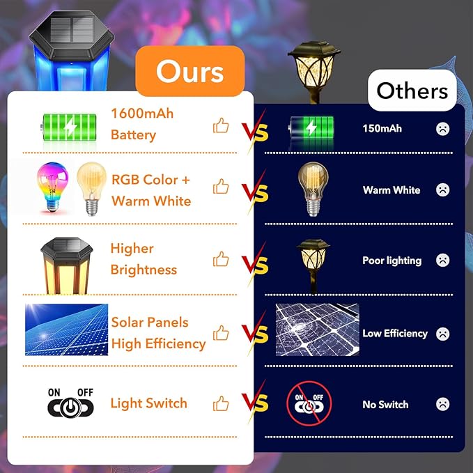 - 【High Efficiency Solar Panel】 Compared with cheap outdoor solar lights, Gedaye is made of imported monocrystalline silicon solar panels and 1600mAh rechargeable Ni-MH batteries, it only takes 6 hours to fully charge, which can provide 10-12 hours of illumination with up to 30% solar energy conversion. Using LED beads, brighter and longer life than tungsten lights.