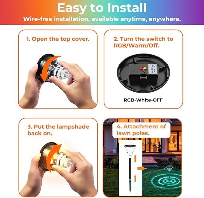 - 【Auto On/Off, Save Money】100% solar energy, outdoor solar lights will auto absorbs sunlight during the day and auto light up at night. Simply turn on the switch before the first use. The solar lawn lights is specially designed for you and fully practical which saving the workforce and expensive electricity bill, perfect for landscape lighting decor.