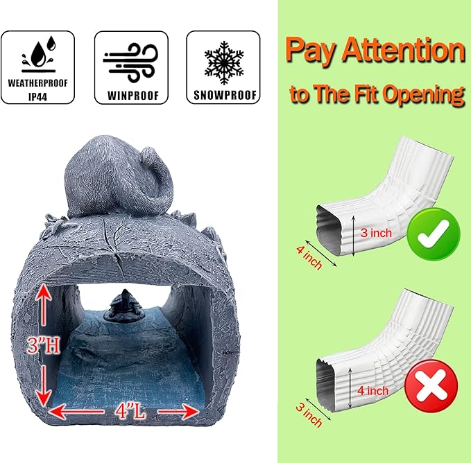 - 🏡【Perfect Size of Animal Resin Statu】Our cute cat decor statue for garden rain gutter downspout measures 8.47"L*6.3"W*8.47"H.It is fitting rectangular downspouts up to 3"x 4".Simply connect the downspout,the extension splash block will fit your garden downspout tightly and perform nicely.
