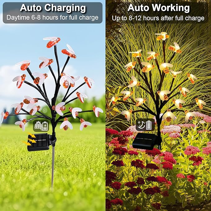 - ๐ใ8 Lighting ModesใLet these bee solar lights outdoor garden stay with your happy time, you can adjust the 8 light modes as you prefer, like combination, waves, sequential, slow fade, chasing flash, slow glow, twinkle flash, steady on.
