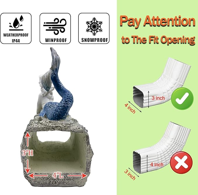 Mermaid Gutter Downspout Splash Block Statue, Garden Outdoor Animal Decor Sculpture, Diverter Rain, Decorative Extension, Waterproof Resin, Fits 3"x4" Rectangular Downspouts, Unique Gift