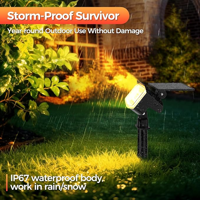 - 【Adjustable Solar Spot Lights】Solar spotlights allow independently adjustable angles for the solar panel and LED solar light. The solar panel can be rotated up or down 100° and the solar landscape lights head can be adjusted up to 135°, effectively capturing the sunlight and getting the best angle of light, as well as to maximize the illumination of dark corners that most lights can't reach, and to illuminate exactly where you want to illuminate