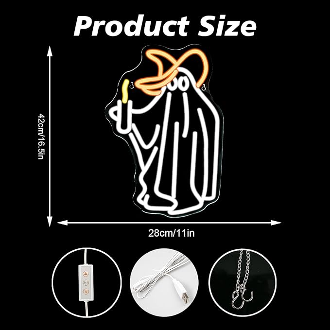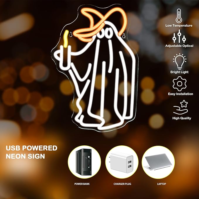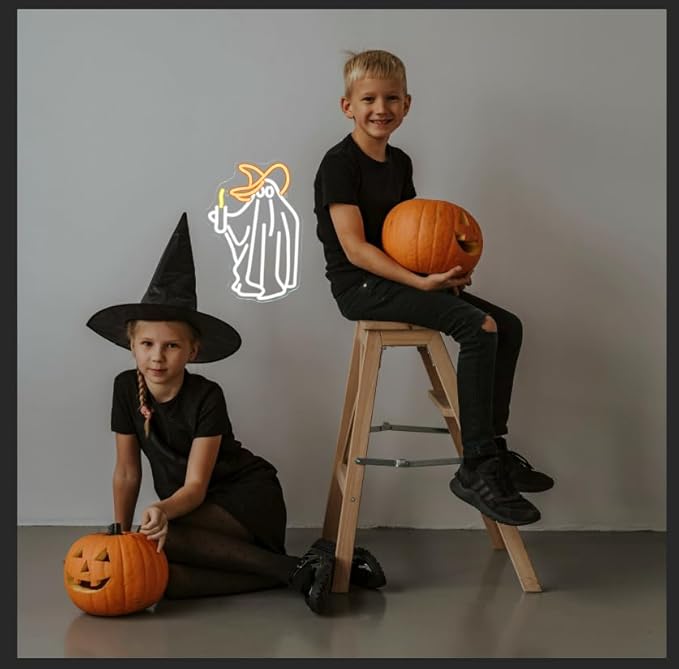 - Ghost Neon Sign: Adorable ghost holding a candle-shaped neon sign, different from normal table lights, with the light to help you create a scary and special Halloween atmosphere