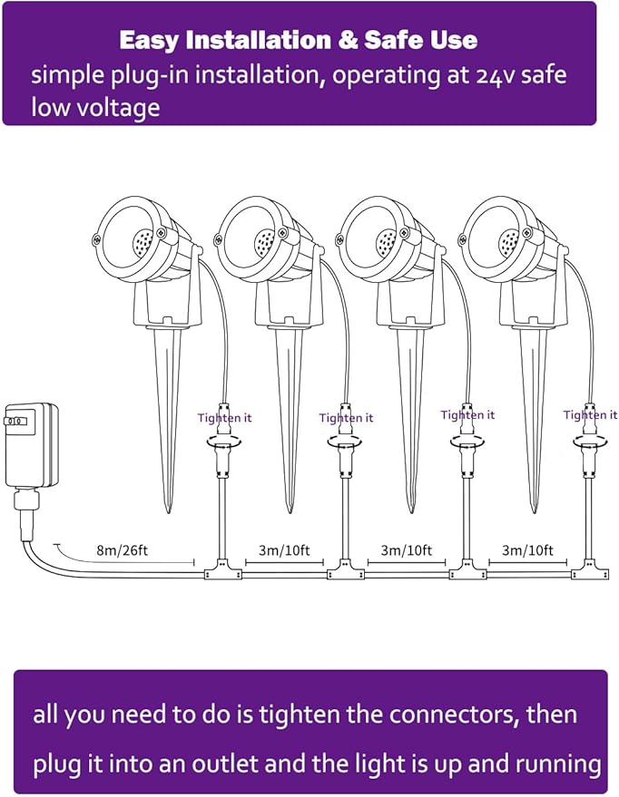 - Safe and Easy to Use: This landscape lighting set operates at a low voltage of 24v, environmental safety and to avoid the harm caused by high frequency. And it comes with a plug-in transformer adopts a simple installation methods, just plug it into an outlet and the light is up and running.
