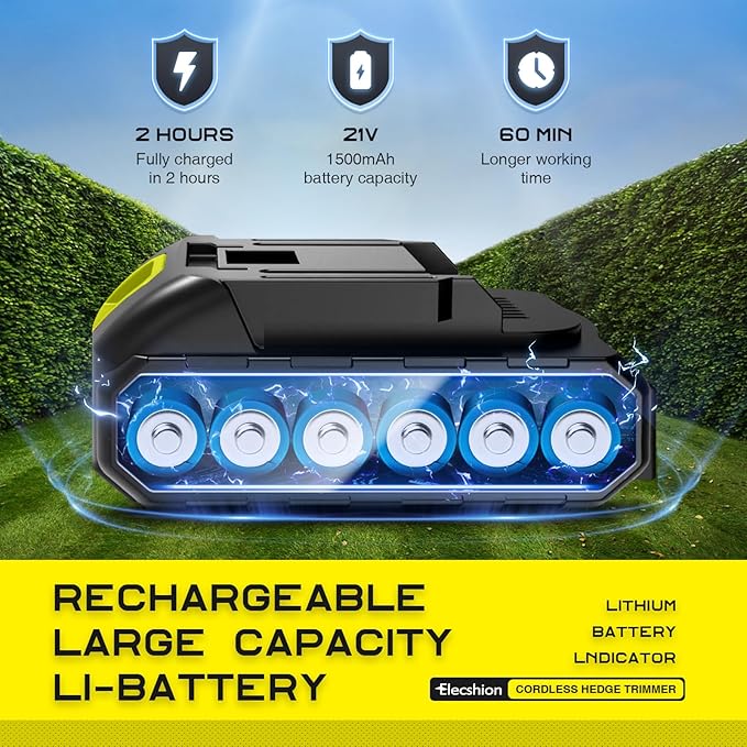 - 2 Pack Rechargeable Battery With Charger : Elecshion hedge trimmer is powered by rechargeable & detachable lithium battery (21V 1500mAh), which makes it hassle-free to use. Fully charged in 2 hours for about 120 minutes working time totally. The cordless grass shear & shrubbery trimmer has enough power to complete your gardening/pruning task.