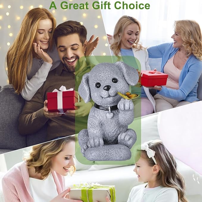 - Charming Dog Statue with Butterfly Solar Light: Handcrafted from eco-friendly resin, this delightful dog statue features intricate detailing and an adorable expression. The solar-powered butterfly light on its paw adds a magical glow to your garden or yard, enhancing its beauty at night.