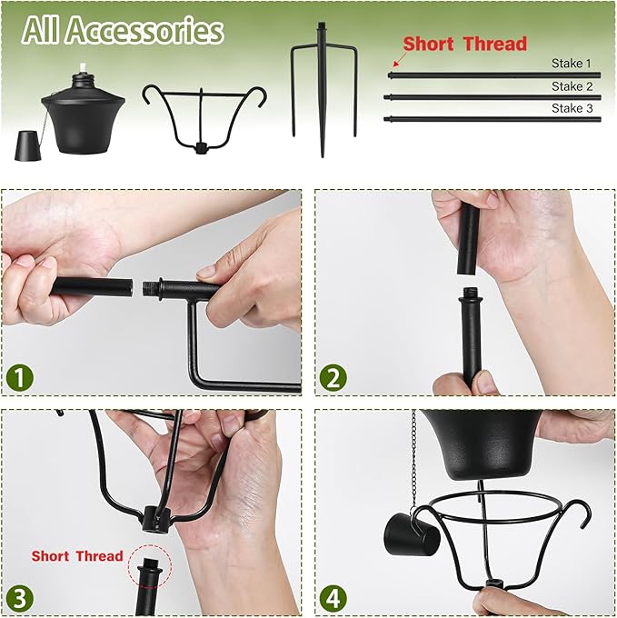 - 【Large Capacity】 Each torches hold approximately 16 oz of fuel, recommended using a funnel when filling torches with oil. Please use snuffer to put out flame and protect the wick after use.