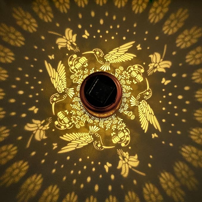 - 【Perfect Garden Decorative】- Hummingbird solar lanterns adopts hollow out design and hummingbird pattern. Solar lanterns could project beautiful patterns, creating a gorgeous and warm atmosphere. Perfect for decorations for garden,patio,lawn,backyards,porch and many other scenes.When lit at night, adding a touch of color to your garden.Size: 7"H x 4.5"W x 4.5"L