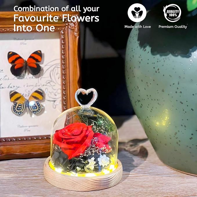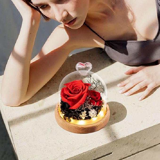 - ๐๐๐๐๐ฒ ๐๐จ๐ซ ๐๐ง๐๐ฅ๐๐ฌ๐ฌ ๐๐จ๐ฆ๐๐ง๐๐? Open the heart-shaped dome to discover two exquisitely arranged eternal red roses. Crafted from select fresh flowers and meticulously preserved, these blooms epitomize enduring passion and deep affection, outlasting traditional fresh flowers by miles
