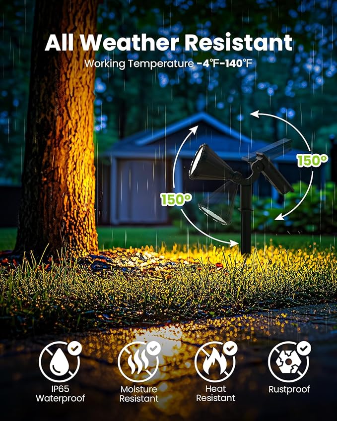 - IP 65 Waterproof: AUDERWIN solar spotlight adopts high-quality ABS material and advanced sealing technology to ensure working at -4 ℉ to 140 ℉. Enjoy long-lasting outdoor use without concerns about rain, snow or other bad weather