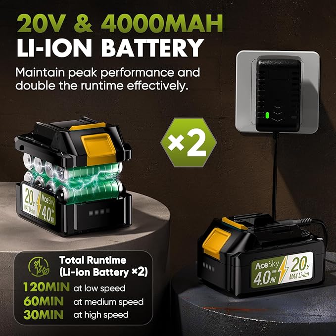 - 🔋【2*4.0AH & 20V Lithium Batteries】Our cordless leaf blower is equipped with Dual 4.0AH lithium batteries, providing up to 120 minutes of runtime in low-speed mode and 30 minutes in high-speed mode. A convenient battery indicator (25%-50%-75%-100%) lets you monitor remaining power and charging progress with ease. Plus, the built-in protection system automatically shuts off the motor and battery, extending their lifespan and ensuring safe,continuous performance for all your outdoor cleaning needs