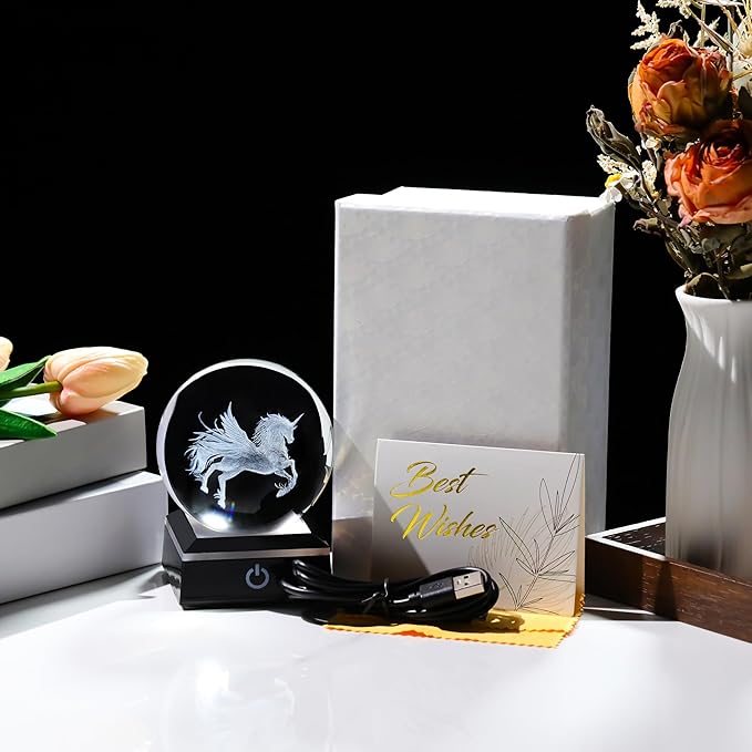 - ๐Crystal Ball Unicorn Lamp- Crystal Glass Unicorn Night Light size: 3.14". Made of K9 Crystal, Interior images are carved by Advanced 3D Laser Engraving Technology.