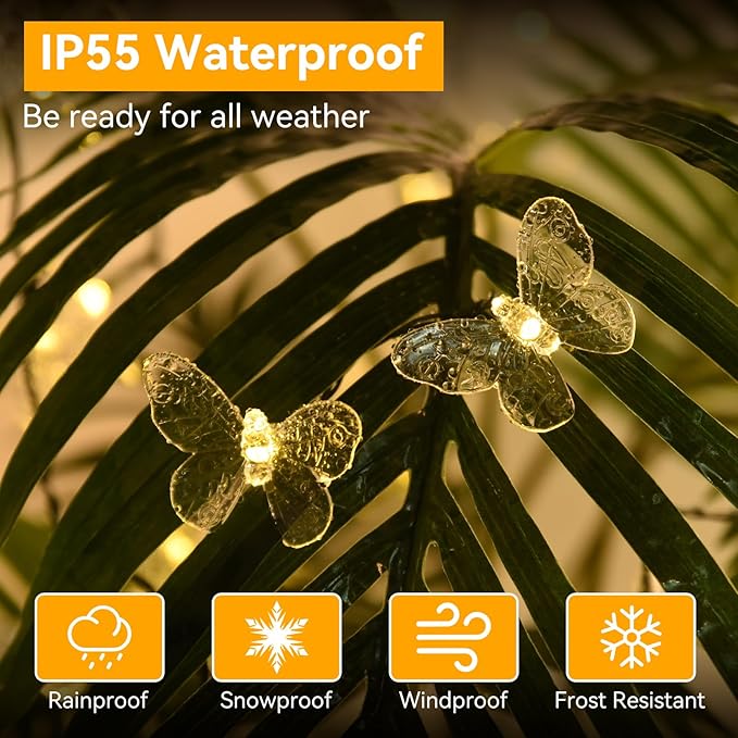 - 【Butterfly Decoration Lights】These string lights are 39.4 ft/12m in length with 100 LED bulbs. The transparent butterfly shape infuses life and vitality to your patio, and the warm white lighting creates a romantic and cosy atmosphere.