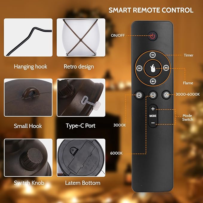 - 4 MODES CAMPING LANTERN: This vintage lantern has one flame mode and three normal lighting modes, and three constant light modes: cool white, warm white, and warm color. It makes this lantern both functional and decorative, switching modes with the remote control and bulb buttons. The remote controls all lanterns from a distance of up to 30 feet. (Tip: Please turn on the light switch before using the remote control)