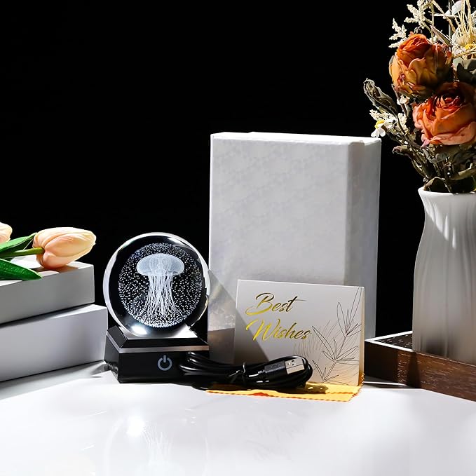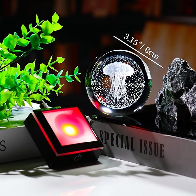 - ๐Crystal Ball Jellyfish Lamp- Crystal Glass Jellyfish Night Light size: 3.14". Made of K9 Crystal, Interior images are carved by Advanced 3D Laser Engraving Technology.