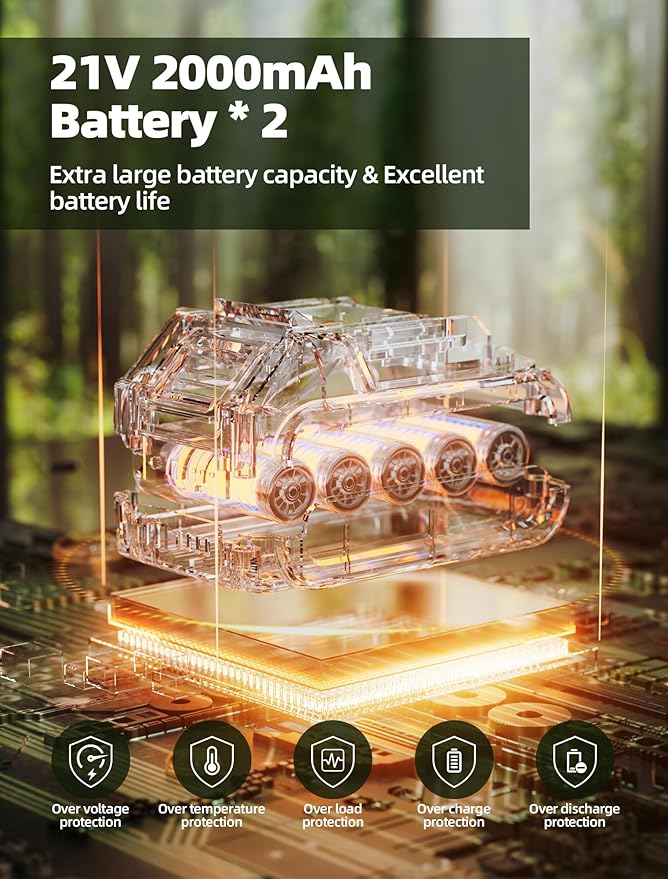 - High Capacity Battery - The upgraded battery enhances the overall efficiency of the cordless pole chainsaw. With 21V capacity, it provides stable and powerful output. A single battery offers 30 minutes of runtime, and the inclusion of 2 batteries ensures you can meet your daily needs without running out of power