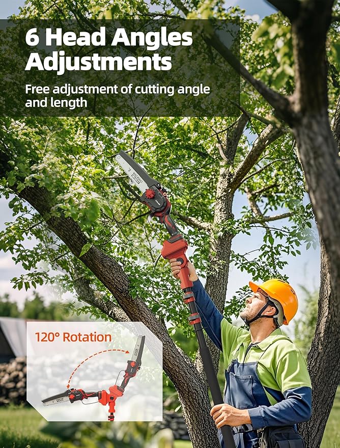 - Adjustable Multi-Angle Extension Pole Saw - The 120° rotatable head provides excellent cutting flexibility, allowing precise pruning from any angle and the pole extends from 5.6 Ft to 9.5 Ft, you can achieve a 15ft reach safely and easily