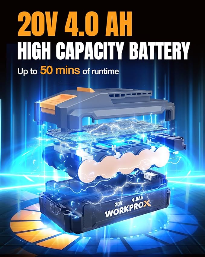 - 20V 4.0Ah Battery & Fast Charging: Powered by a 4000mAh battery, this electric chainsaw provides up to 50 minutes of operation and charges in just 1 hour. An LED power display helps track battery status, and it doubles as a portable power bank for emergencies