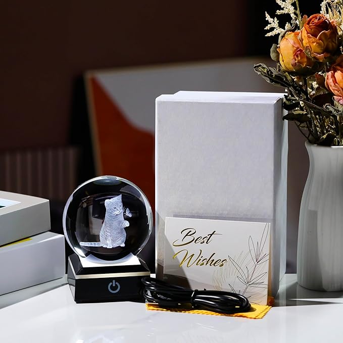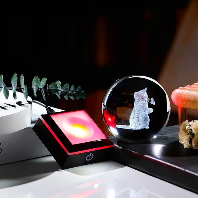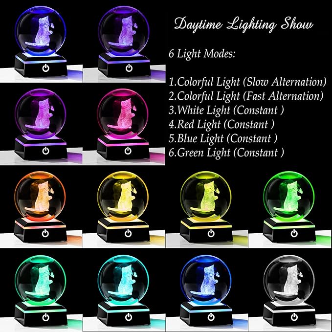 - ๐Crystal Ball Cat Lamp- Crystal Glass Cat Night Light size: 3.14". Made of K9 Crystal, Interior images are carved by Advanced 3D Laser Engraving Technology.