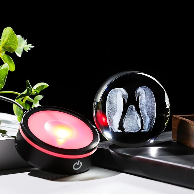 - Colorful LED Light Base: The light of the LED light base can automatically change color or fix the color, there are six lighting modes, and it will make the pattern of the penguin ball figurine clearer. It's powered by 3pcs AAA batteries or charging cable (batteries and plugs are not included in the package). You can charge it with a cable connected to a computer, car, or portable charger