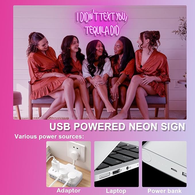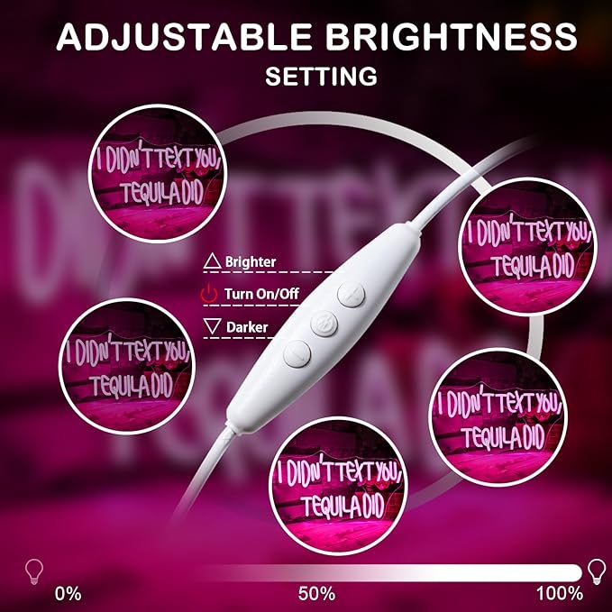 - Adjustable Brightness: Whether creating a romantic dinner atmosphere or a lively party vibe, our "I didn't text you, tequila did" neon sign adds a charming glow to your setting. With its brightness adjustment feature, you can effortlessly control the softness or brightness of the light, making it for any occasion