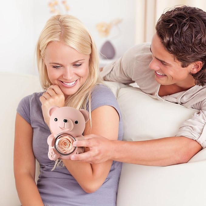 - ๐ Unique & Cute Bear Design: The adorable teddy bear holds a stunning preserved rose inside a transparent plastic cover. Rotate the golden heart-shaped knob to reveal a hidden jewelry box behind the rose, adding an element of surprise for your beloved one!