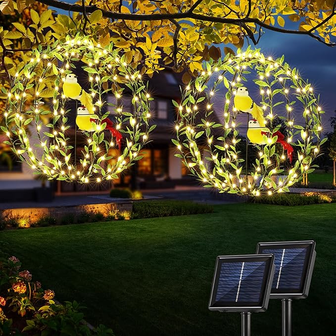 Joomer Solar Lights Outdoor, 2 Pack 12in 120 LED Solar Hanging Light Balls Outdoor, 8 Modes Waterproof Foldable Metal Sphere Light with Hook for Outside Hanging - Warm White(Ball with Green Leaf+Bird)