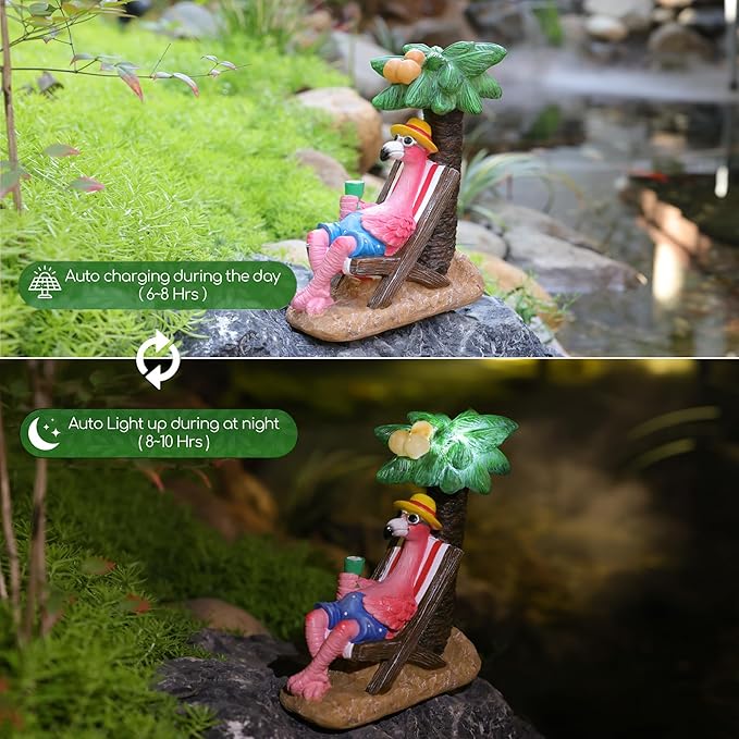 - 【BRIGHT UP COCONUT TREE】Just toggle the top switch and leave it in the ‘on’ position in the daytime.The coconut tree behind the lawn flamingos decor emits a warm and bright glow after the sunset.The solar panel will charge within 5-8 hours during the day and light up automatically at night for 8-10 hours