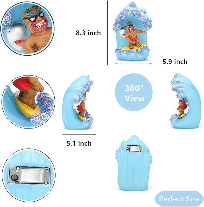 - 【BRIGHT UP SEA WAVE】Just toggle the top switch and leave it in the ‘on’ position in the daytime.The entire wave behind tiki surfers will emit a warm and bright light and bright glow after the sunset.The solar panel will charge within 5-8 hours during the day and light up automatically at night for 8-10 hours