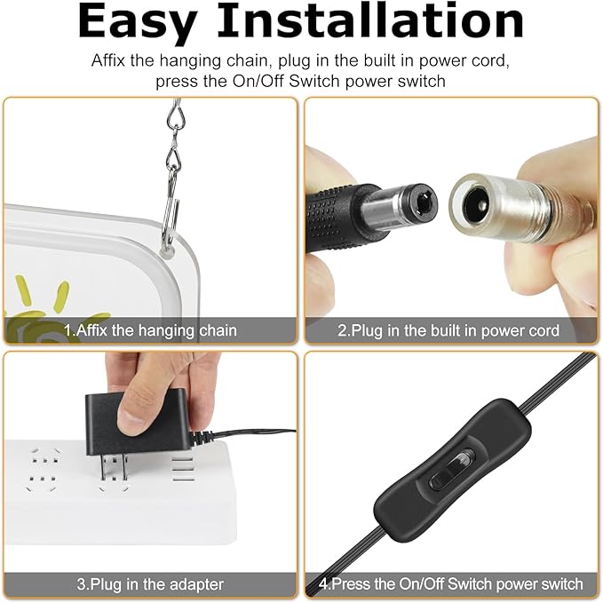 - Easy to Operate: Our LED open signs made of high-quality clear acrylic material. Two peg holes on the acrylic backer board for convenient hanging. It comes with a 2-meter extension cord, allowing you hand it anywhere, even far from the power supply.(included hanging chain). It is simple to open the sign in the morning to start the day and close it in the evening to signify the end of business hours. No need to remove the adapter from the socket daily