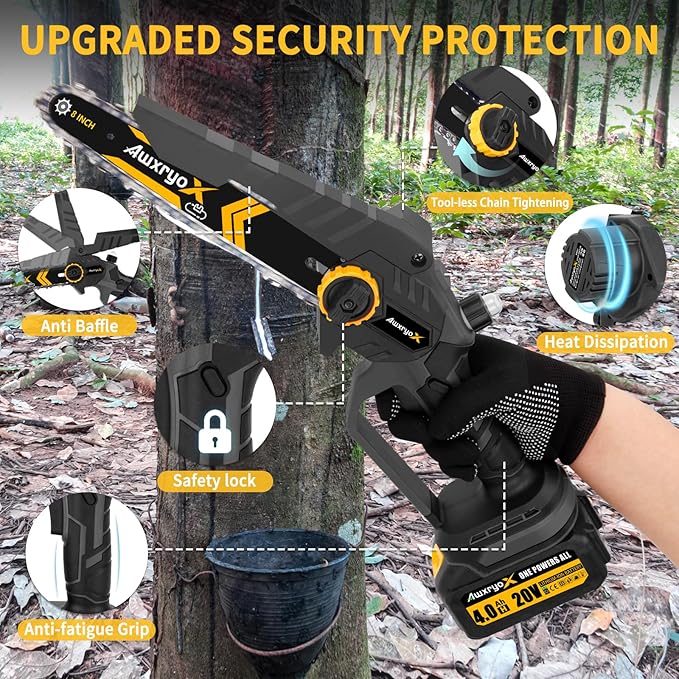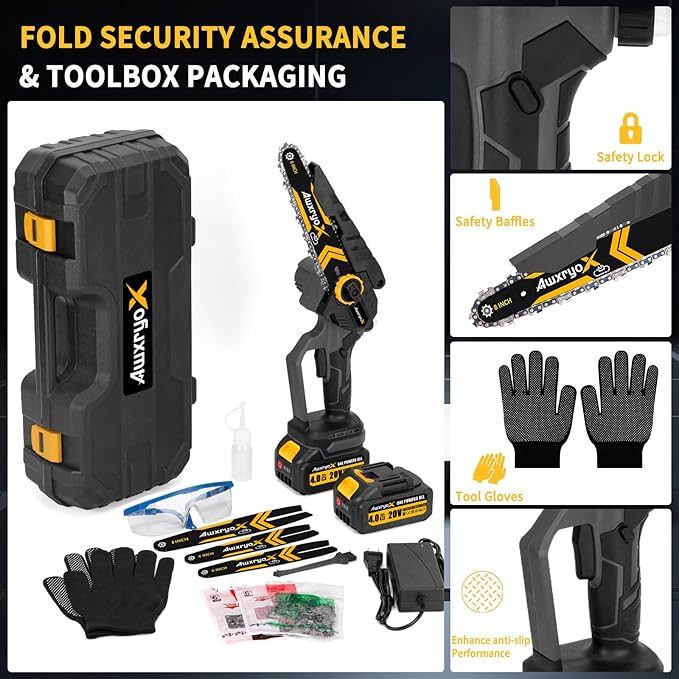 - 5 Safety Modes To Protect Your Safety - AwxryoX has upgraded the mini chain saw battery powered with 5 safety modes in order to protect your safety.1, Safety lock to prevent accidental activation (you must press the safety lock and trigger at the same time to activate the chain saw).2, Splash guard to prevent wood chips from flying around.3, Enlarged rubber non-slip handle for a firmer grip.4, Safety gloves to protect hands from Cutting. 5, Goggles to protect your eyes from accidental splashing. Your safety is our first