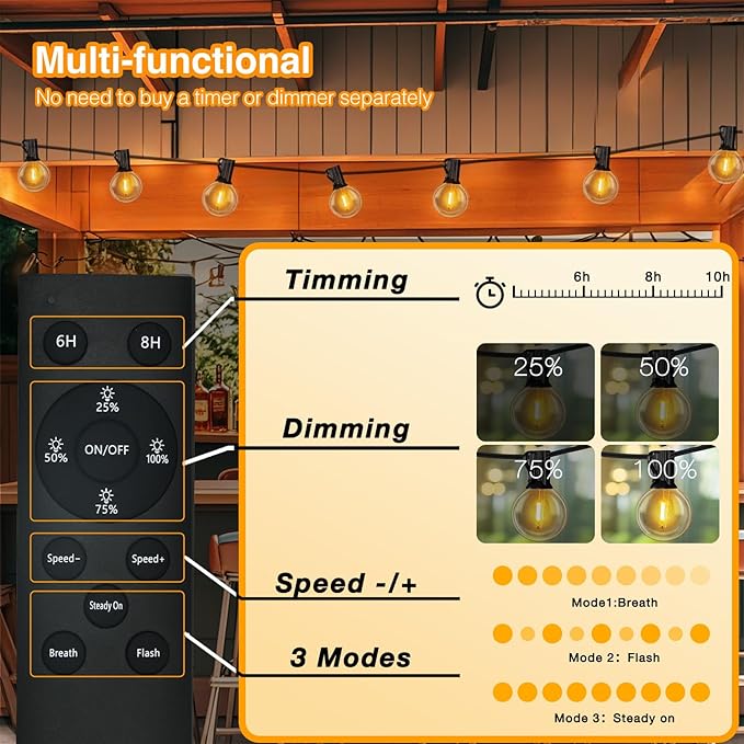 - Multifunctional Remote Control: Adjust the brightness levels (25%, 50%, 75%, 100%), set timers for 6, 8 hours, and 3 Brightness Mode: Soft/Bright/Super Bright. One remote, endless charm—no extra timers and dimmer required, making saving energy and saving power so simple and easy.