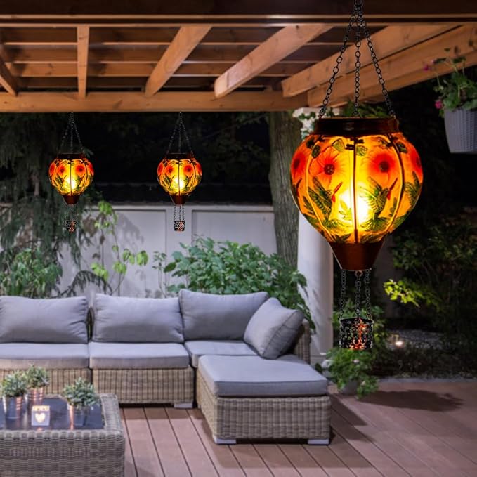 - Solar Lanterns Outdoor: The 2 pack solar hot air balloon lantern with flame is made of 8 pieces of glass with hummingbird patterns. As night falls, the bright colors and flickering flames resemble rising hot air balloons, creating a stunning visual effect