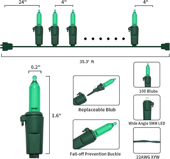 - 【Mini Saint Patrick's Day Lights Specification】: 2 Sets - white wire chritsmas light string includes 100 count red LED lights, total length 35.3ft, lights length 33ft and each led is 4 inches apart, 24 inches lead wire, 4 inches end connector (Extra 2 x bulbs and 1 x fuse included)