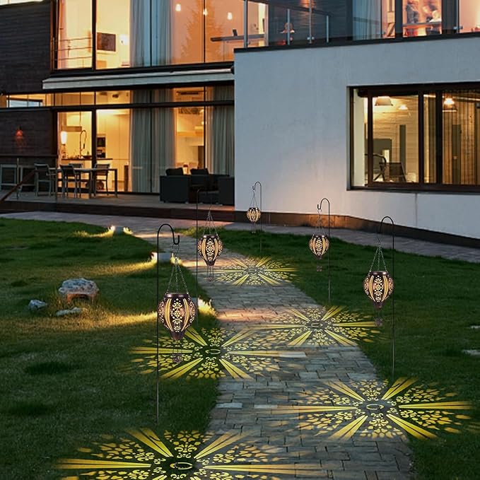 - 【Gorgeous Design】-- The outdoor solar lanterns combine vintage Morocco patterns. The decorative lantern emits soft golden light at night and displays beautiful patterns on the ground or wall. It is a gorgeous and unique outdoor garden yard decor.